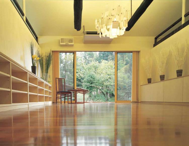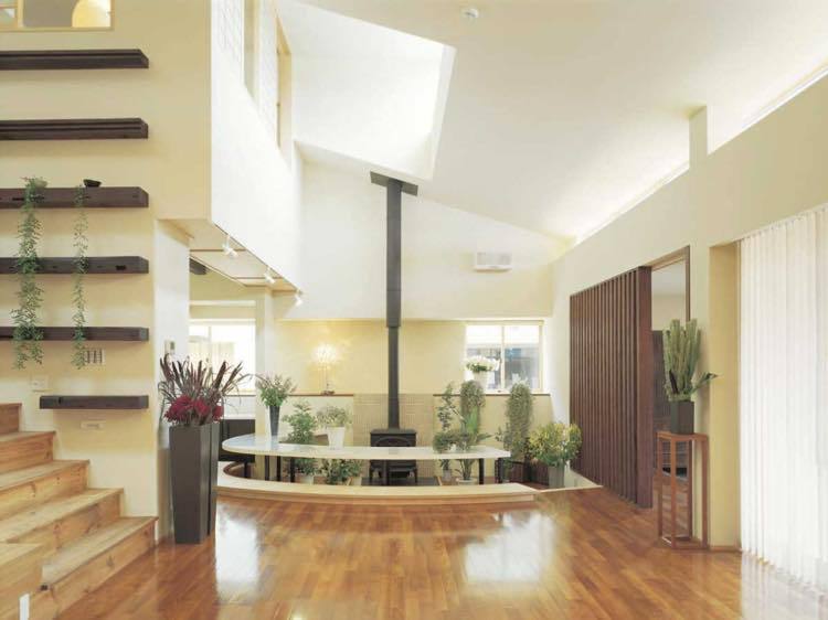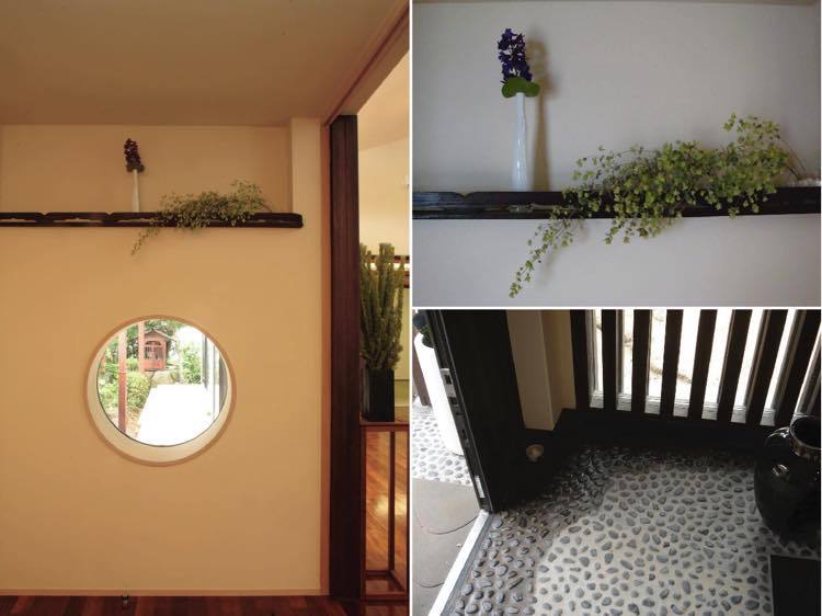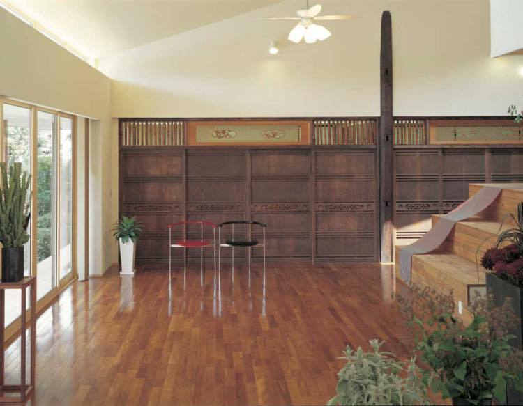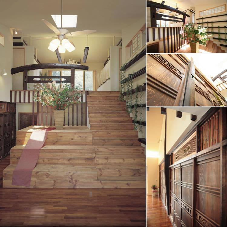 裏庭と繋がる大階段は、日本の季節のイベントごとに飾り付けられるステージです。です。床下を外せば収納になっています。旧家の床板をカンナにかけ古色の塗装をしています。