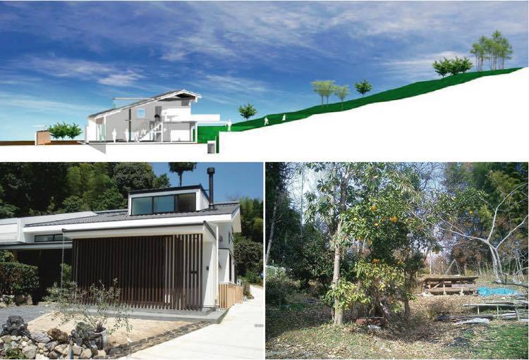 裏庭が小山になっている住宅です。裏庭には、果物や野菜を栽培されていて同時に子供たちの遊び場です。地方でも核家族化が進み敷地が広いため同一敷地内に若夫婦の別棟を立てるという風潮とは逆に大家族が屋根の下一つに暮らすという生活を望められ、大きな一枚の大屋根の下での生活が展開します。