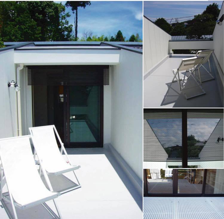 大屋根をくり抜き書斎に面するテラスを設けました。遠くに湖を望みアルミ葦簀により遮光しています。裏山に面するテラスは、下部がドライエリアになっているため風と光を通す樹脂製のグレーチングをはめています。