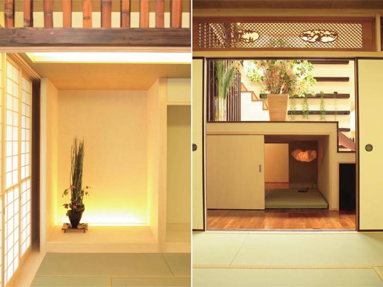 大階段の下は、収納になっていますが、茶室のような特別な空間としても使えます。床の間の仕上げは、お施主様と京都で見つけた和紙が重ねて貼られています。