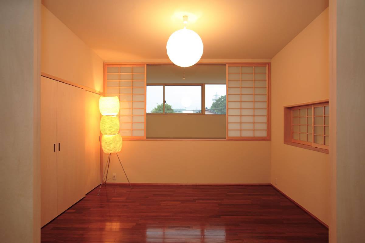 和室部分は、リビングと色調を変えました。天井の仕上げ材は、薄いゴールドの和紙と間接光の組み合わせです。寝室部分は、WC・洗面・収納・坪庭を壁の中に収納しました。