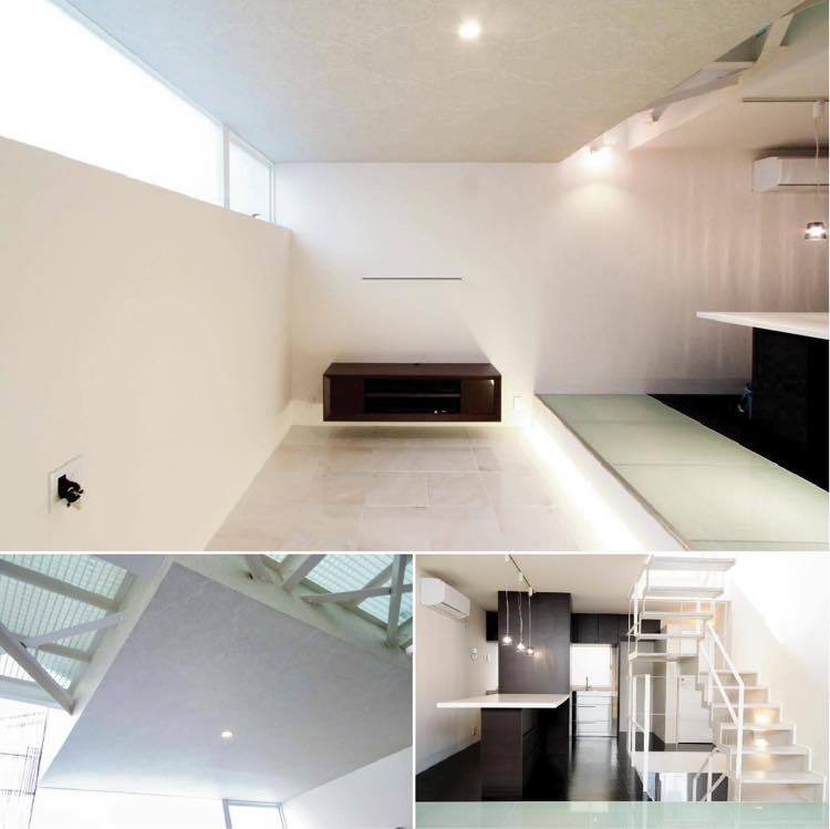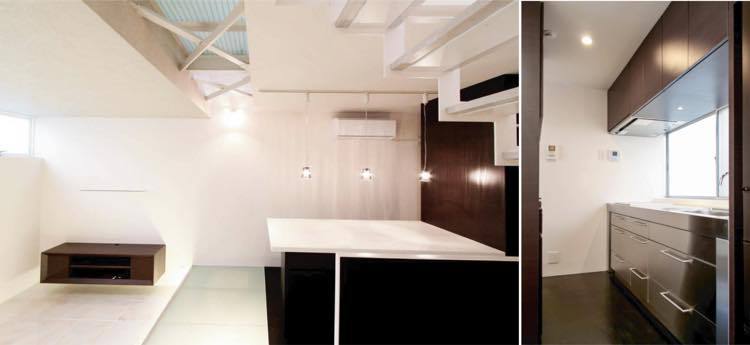 リビングの上に個室を浮遊させ、部屋と床の隙間からも3階のトップライトからの光を落とします。一段下がったピットリビングにすることにより狭いが豊かな空間を出現します。キッチンは、調理行為や細々したものを隠し、色を床共々黒くしテーブルだけを浮かし食べる行為を見せていくデザインにしました。