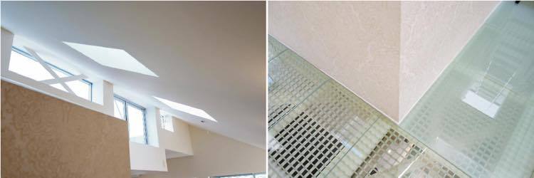 1階の玄関に光を落とすために透明の樹脂グレーチングに強化曇りガラスを配置し、キッチン用品が隠れるようにコンパクトにデザインされた作り付け家具が装備されています。