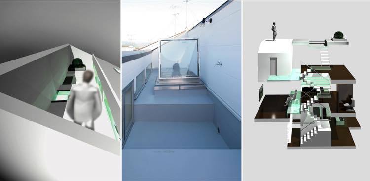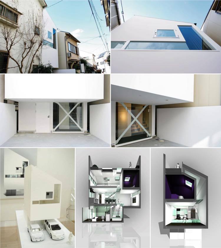 都市部で3階建以上の建物と住宅が混ざり敷地いっぱいに建物が建っている地域にあり、前面道路が狭く都市の中のカオスの中に隠れ家的な空間を考えました。狭い敷地なので規制いっぱいの容積を確保しました。形が三角なのは、北側斜線のためで、ハンデを逆に楽しい空間を作るためのモチーフとしています。