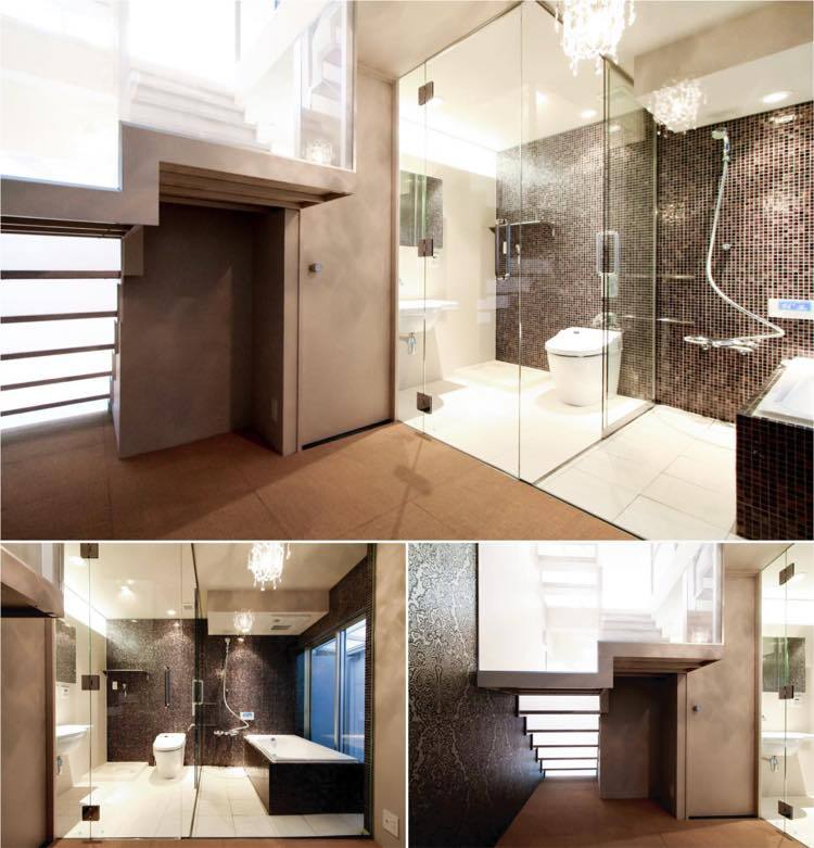 駐車場と庭を設けたため狭くなった1階に水回りを持ってきました。ガラスの壁で仕切ることにより狭さを感じさせないのと、内装の仕上げを素材・色彩を多用することで楽しくて気持ちのいい水回り空間を実現します。