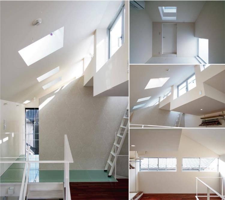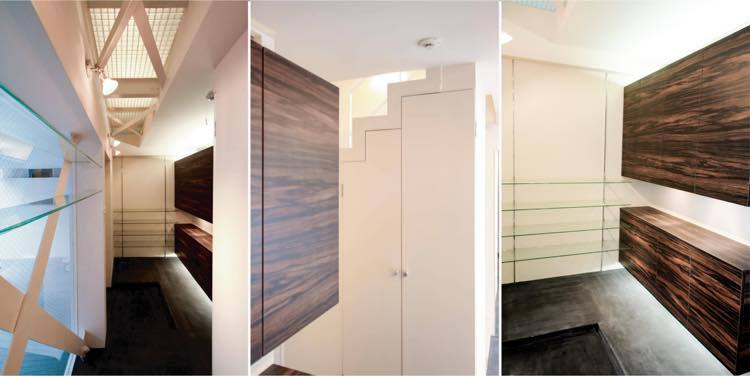 シースルーの階段・天井・庭・欄間より光が漏れるようにして採光します。狭くても収納を充実するためにスペースを探して作り付けの家具や棚を装備しています。