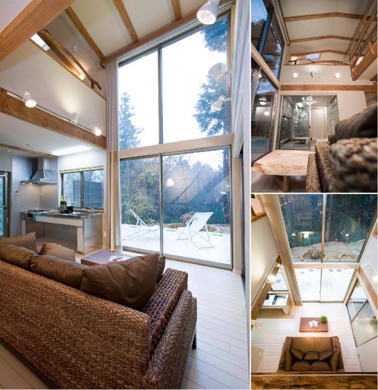 規制により建坪12坪という条件の元、吹き抜けを駆使してワンルームにし狭小物件であることが感じないようデザインしました。森林に面しての背の高い開口はどこからも緑が飛び込んできて気持ちの依倚空間です。サッシは、上面が嵌め殺しで仮面が引き違いで。枠が細く見えるものを選んでいます。外部での食事等も余裕でできるように建物と同じくらいの広さのテラスを設けています。