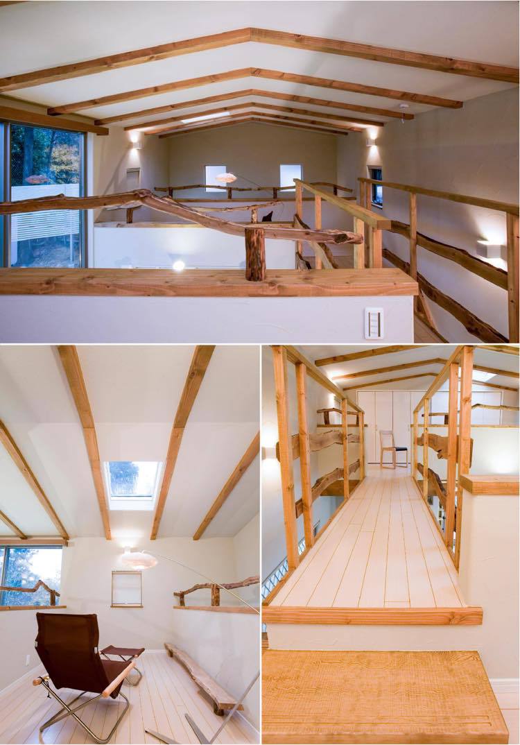 腰壁で仕切られた床は、森の中で浮遊している感じがする特別な空間です。トップライトからは、月明かりや星空観察を楽しみます。