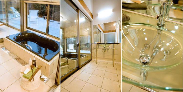 森を眺めながら森林浴をするためにリビングの中にスケルトンな浴室を配置しました。タイルの色は、部屋の色と合わせ一体感を持たせ、洗面スペースを広めに取り、観葉植物を置き部屋をジャングルのようにしつらえます。