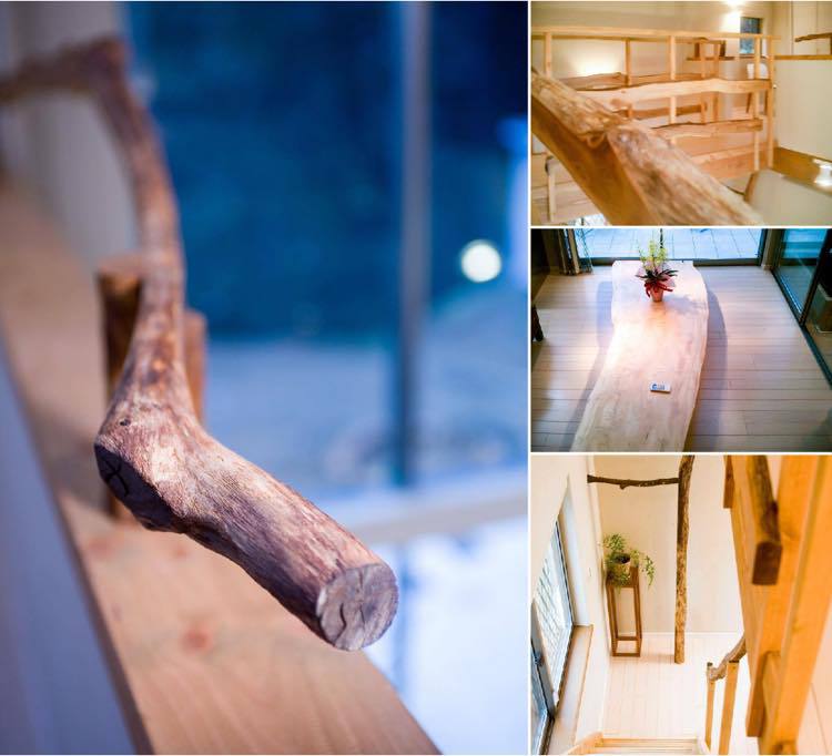 曲がった天然木の空間は、お客様の憧れでした。手摺・洋服立て・テーブルと逆にうるさくないように真っ直ぐににカンナがかかった板とバランス良く配置しました。