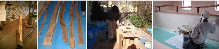 北海道産の天然木は、家具作家さんにお願いし手に入れました。その場でこう削ると美しい表情が出るというアドバイスをいただきました。曲がった木を大工さんが見事に加工して取り付けてくれました。壁面は、自然素材の塗り材料を金コテ仕上げです。