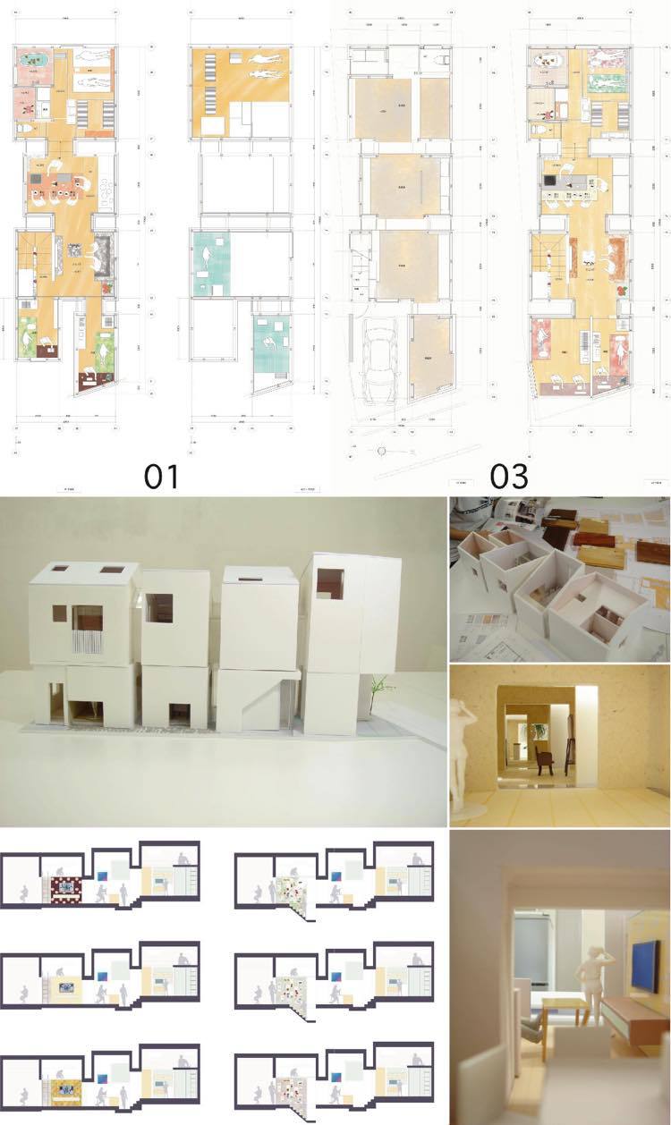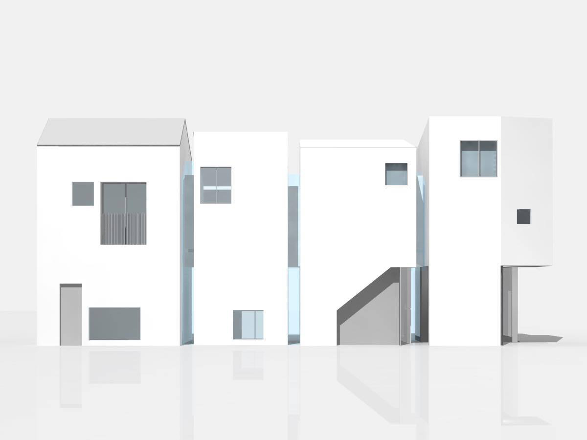 都市密度がそれほど高くない郊外の幹線道路沿いに建つ美容室併用住宅です。1階部分が美容室で、間口が狭く駐車スペースが必要な店舗です。大小形の違う建物4件がガラスによって繋がっている形で、何らかの物語性が感じられる建物にしました。