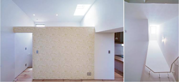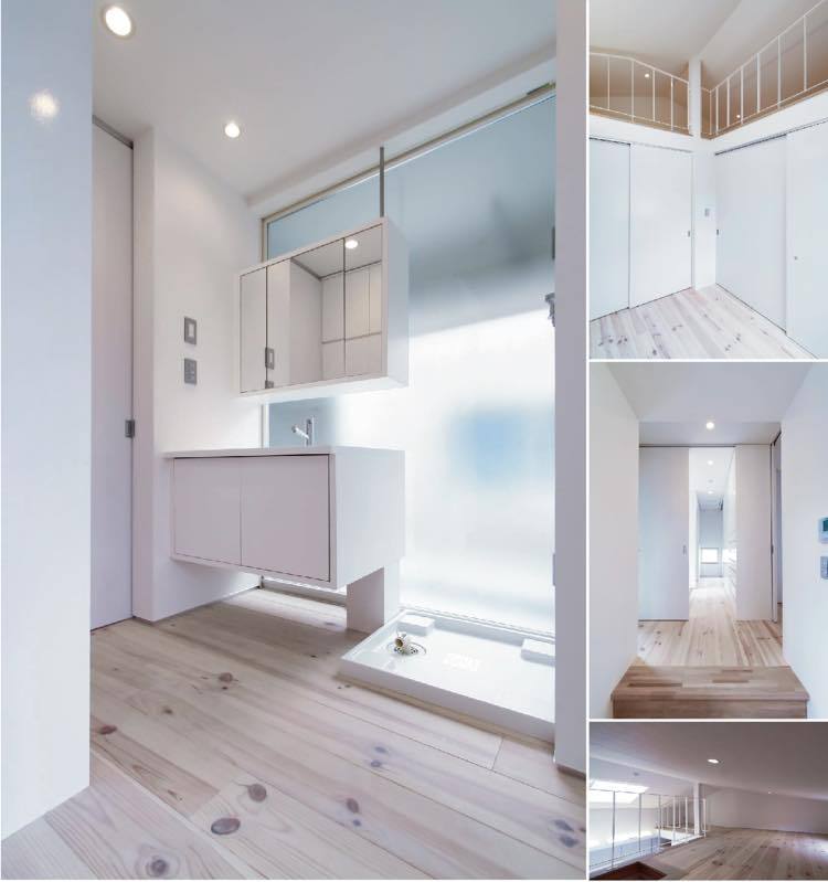リビングに面する洗面スペースです。裏側に階段が通り、壁面は、装飾壁紙が張られ天井面まで壁はなく、ロフトにすることで、空間に広がりができます。ロフト部分は、一部ポリカーボネイト仕上げになっていてトップライトからの光が降り注ぎます。