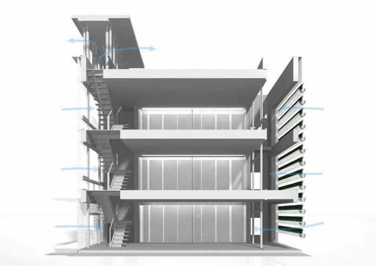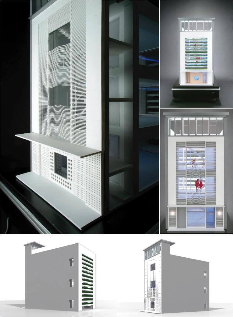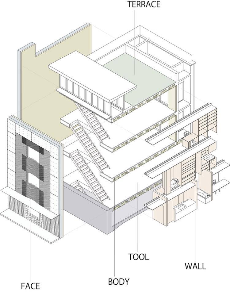 三方を3 階建て以上の建物に囲われるような、都市密度の高い場所に建つこの建築は前面道路からの通風を捉え夏と冬の空気の流れを制御し快適性に寄与します。また塔屋は、階段やPS、エレベーターシャフトも内包します。