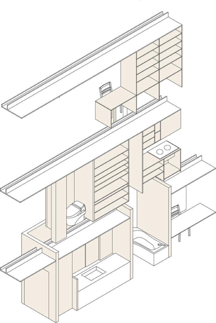 壁面に収納・設備を組み込み限られたスペースを有効に使い、物が片付き、必要なものだけが見えるようにして生活を楽しむ空間に寄与します。ユニット家具なので組み換えが容易に行われます。