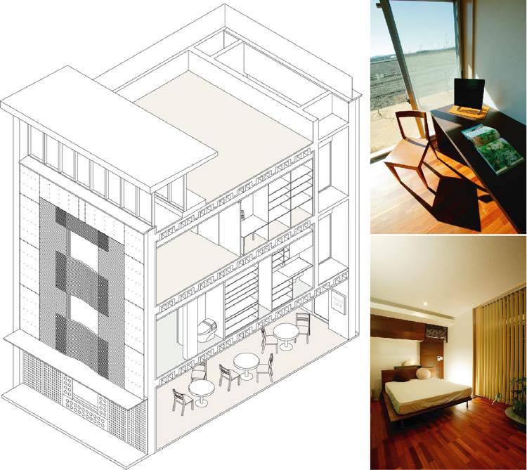 開口部を道路側と反対側に設け光と風の代謝を積極に行うようなファサードデザインです。四季を感じ省エネにも寄与します。