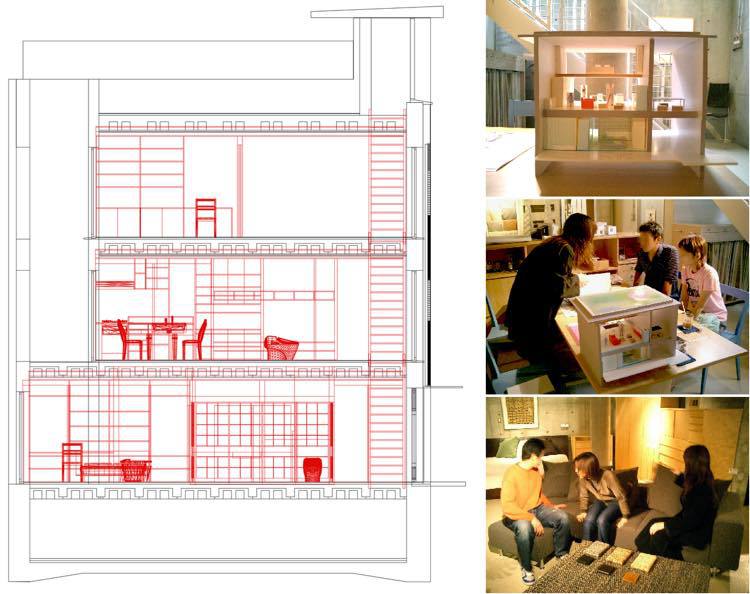 HOUSE Hは、「CELL」住宅を想定し、実際にお客様が住宅をデザインされるようにプログラムしました。まず、敷地に合うスケルトンの「BODY」模型が提示され、「WALL」や家具のミニチュア模型を並べ替えながら同時に、インテリアショプの家具を試しながらインテリアコーディネイターさんとディスカッションを重ね、室内の素材・色彩・照明・家具も決められていきました。