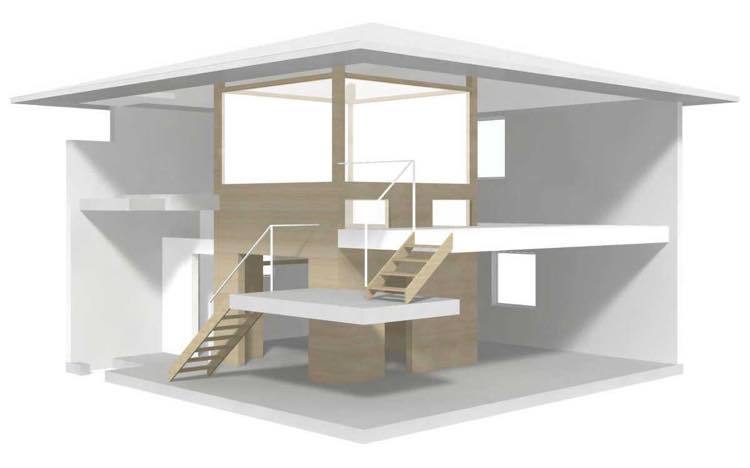 玄関から小さな方の箱を添いながら2階のスタディルームにあるバルコニーまで、一続きの空間になっています。まず、半分の高さの階段を登ればステージが現れ次々にステージが連続していきます。
