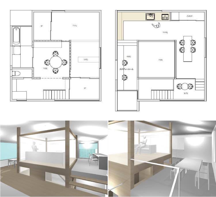 平面が7280×7280の大きさの方形の家です。「CELL」は何もない可変性のある空間で生活を楽しむことを考えましたが「PRT」は、まず趣のある空間がありそこからを起点に楽しい生活をイメージしていきます。方形の外壁の中に中心をずらした小さな立方体を配置します。そこで生じる空間の使い方は住む人が独自に決めていきます。
