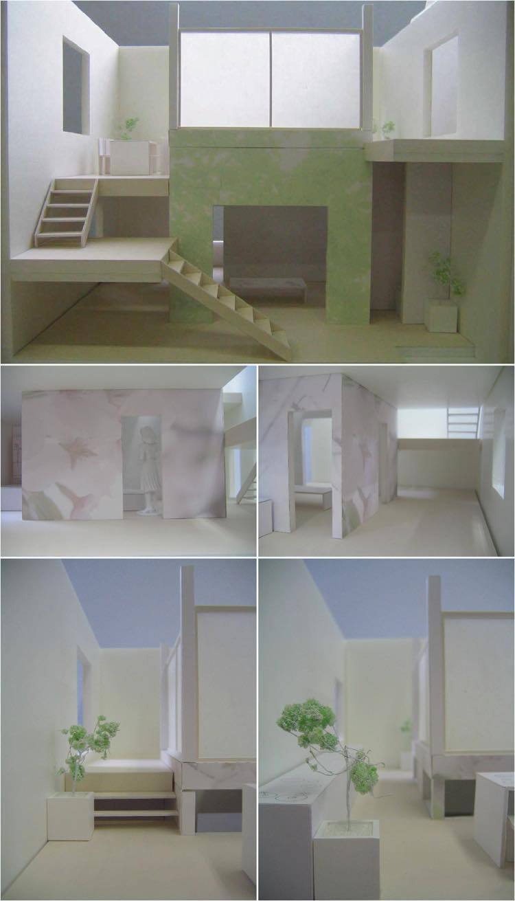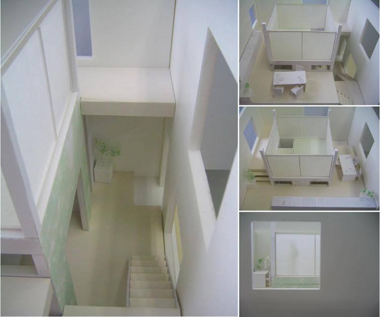 1階の中央は、多目的コーナーになっていてその周辺に個室や浴室があります。2階に至るまでにリビング・ダイニング・キッチン・スタディコーナーにすることができ、頂上部は、・リビング・多目的コーナーにもなります。また、それぞれの箱の壁の素材や色彩を変えることによって、より豊かな空間を楽しむことができます。