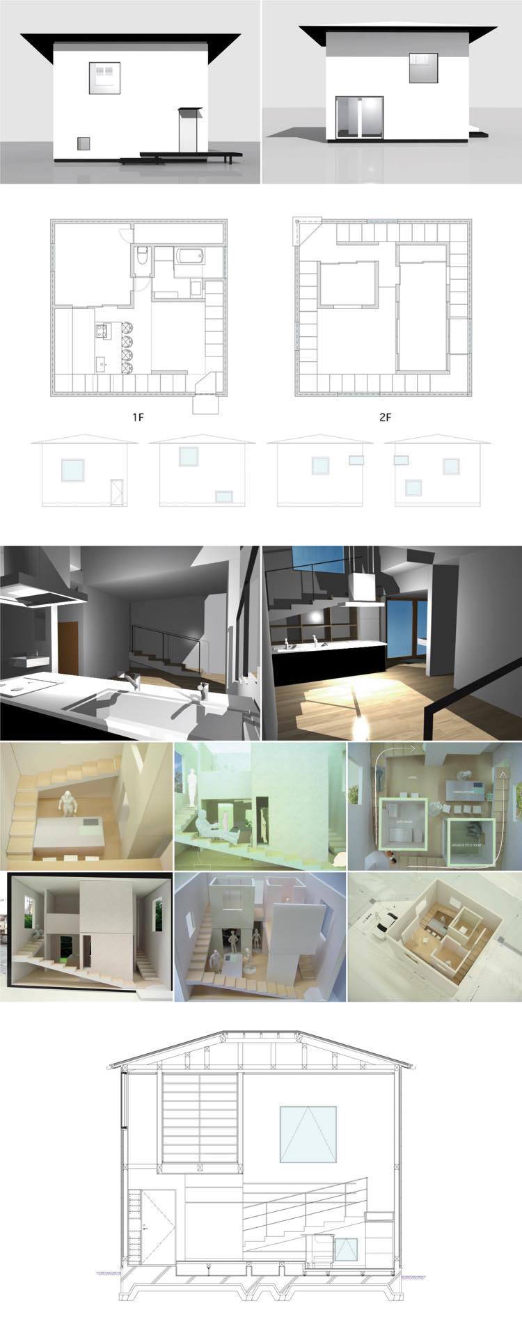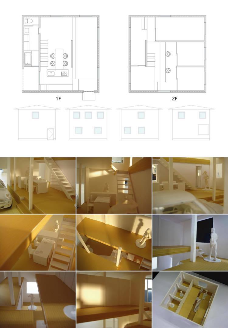 木造の30坪のPRTで陸屋根で一回り小さな箱が内蔵するタイプです。建物の周辺を回遊するギャラリーであるスロープがありスロープの高さに呼応した部屋が現れます。リビング・ダイニング・キッチン・スタディーコーナーが家全体のワンルームにあり、個室はその中に点在しています。各部屋への採光と通風は、ギャラリーが縁側のように機能し特別な空間を提供します。