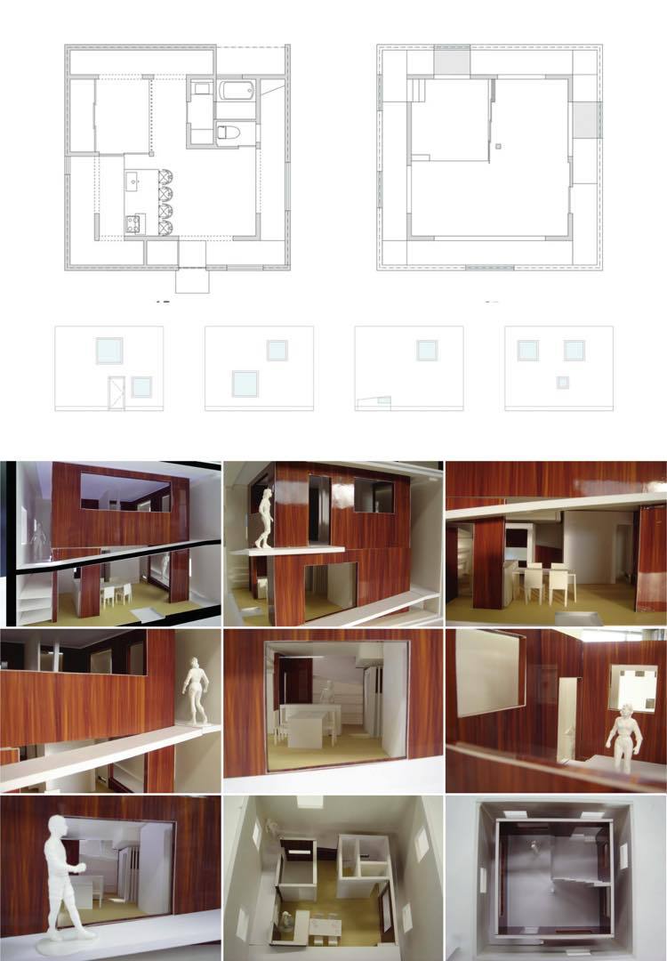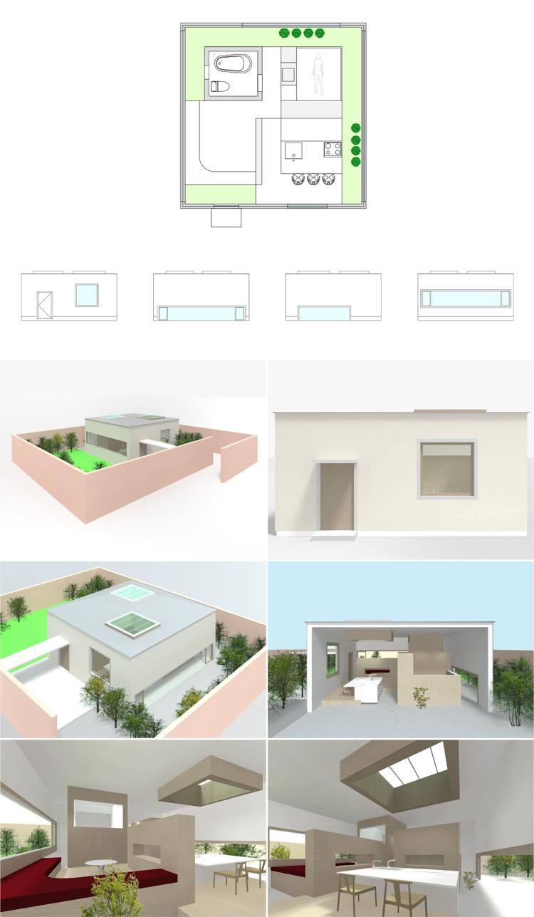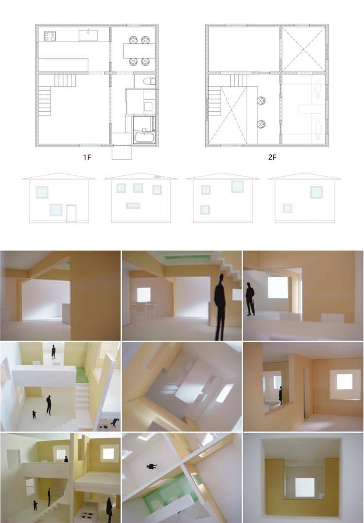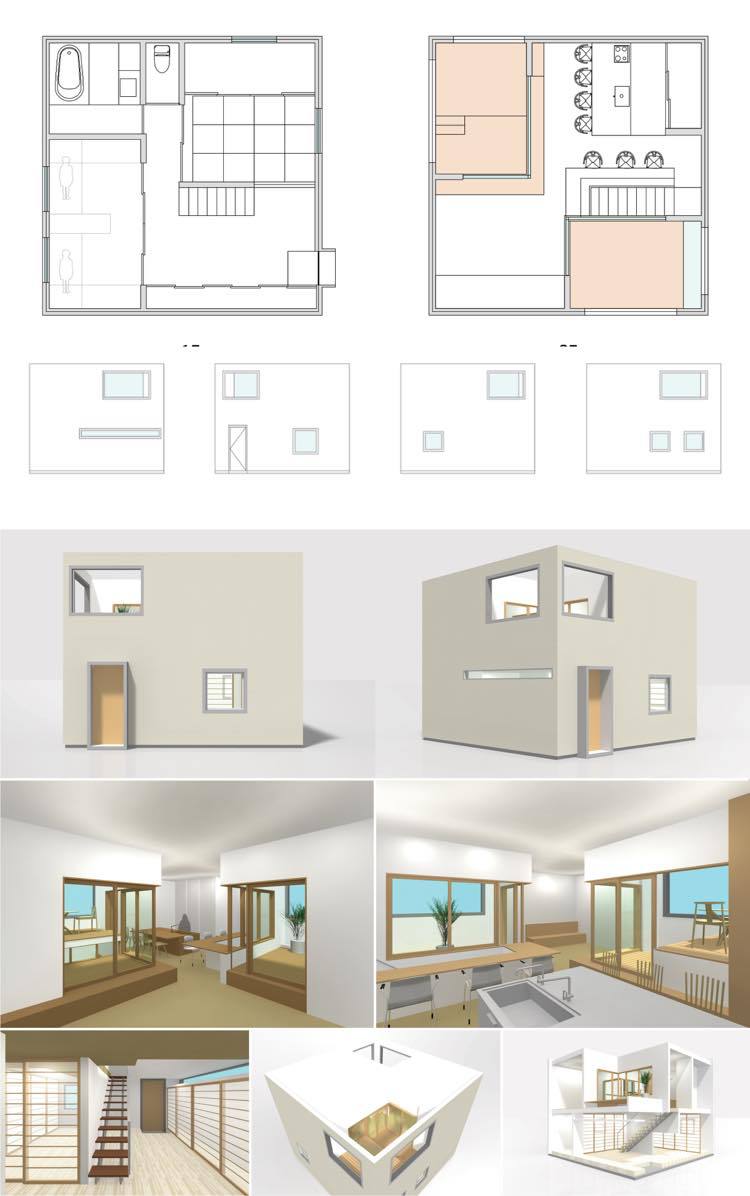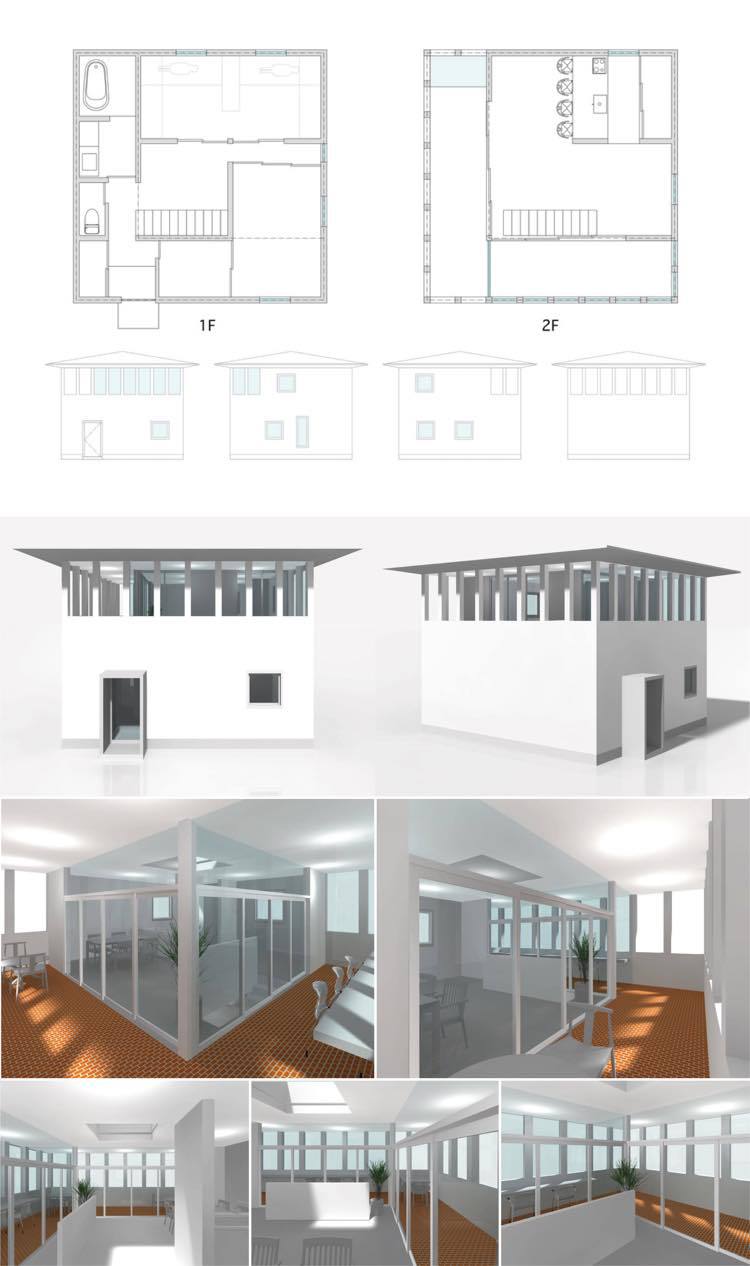 木造の30坪のPRTで陸屋根で建物の中ににテラスを内蔵するタイプです。内部に外部を織り込み明るくて豊かな空間を演出します。1階部分は、個室・浴室がありテラスからの光が差し込みます。2階部分は、対角線上にテラスが配置されリビング・ダイニング・キッチン・スタディーコーナーがワンルームに配置されプライバシーを守りながらの外部でのくつろぎを与えます。