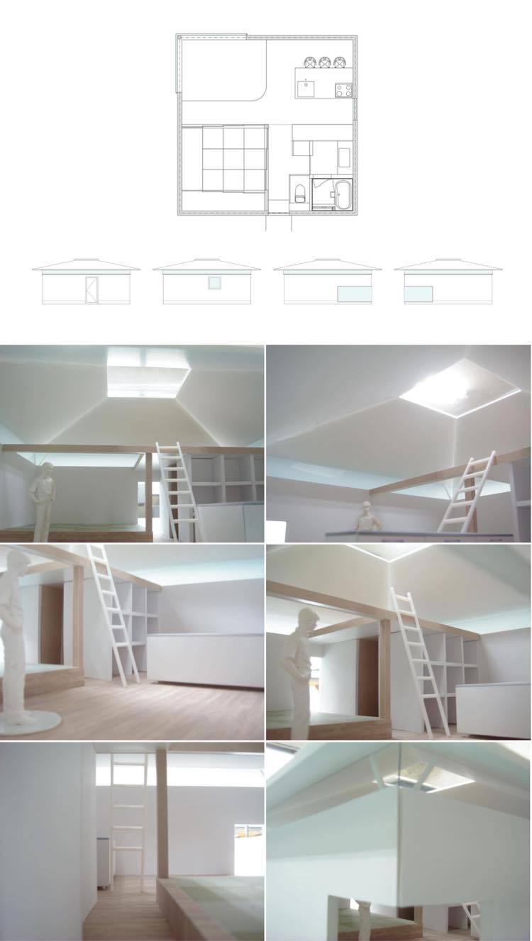 木造の15坪のPRTで深い庇の寄棟屋根で平屋建ての1~2名用の住宅です。屋根形状に合わせた天井の最上部がトップライトで天井と壁が交わる部分4方向を開口部にして、光の満ちたワンルームにします。