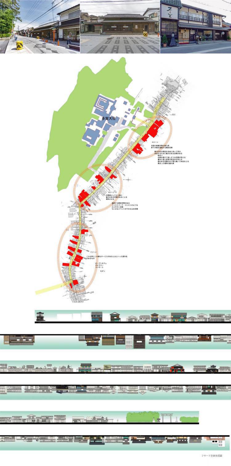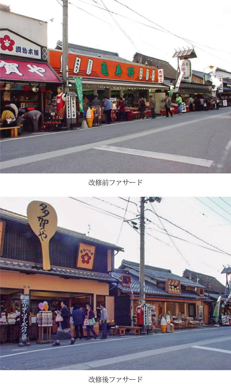 都市の新陳代謝に比べ地方の個人店主の集まった商店街 は、変化するにも個人では太刀打ち出来ない状況があります。このプロジェクトは、公的資金の補助を受けつつ最小限の投資で古い建物のファサードを改修し、かっての門前町としての賑わいを復活させることです。 この事業に32件の店舗が参加され設計同人舎が設計を担当しそれぞれを分担して進めました。