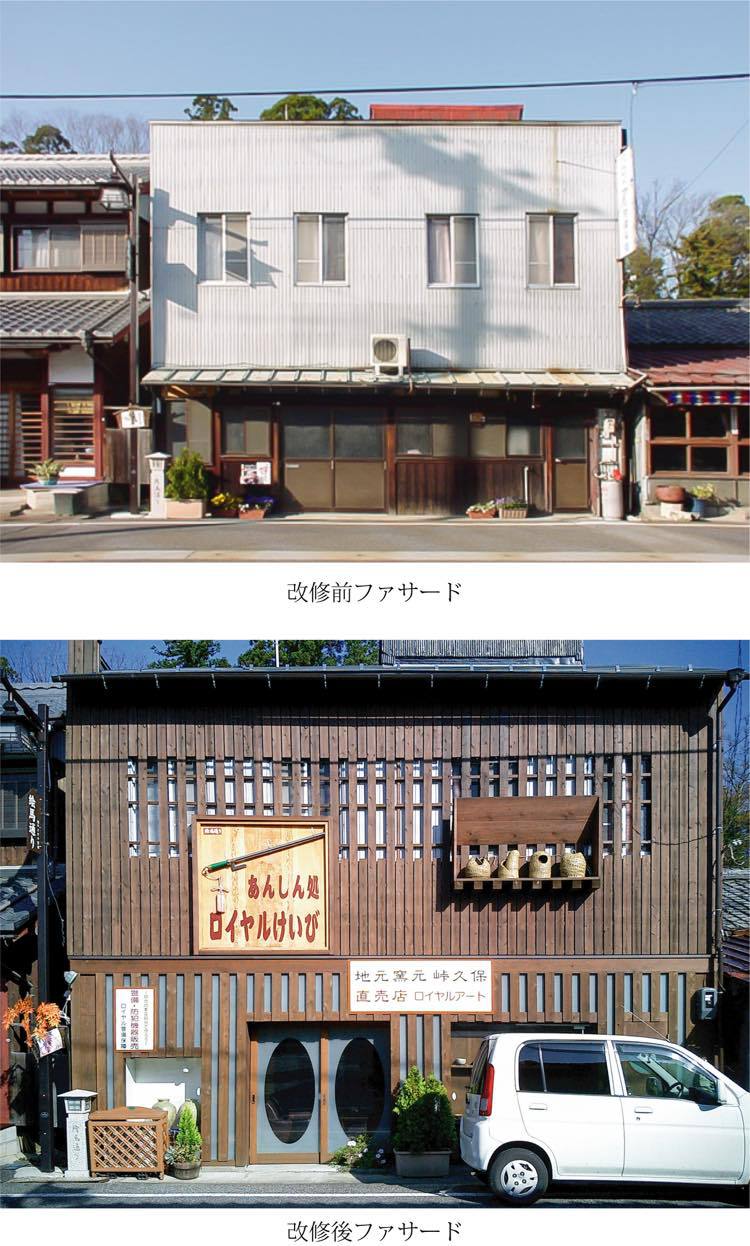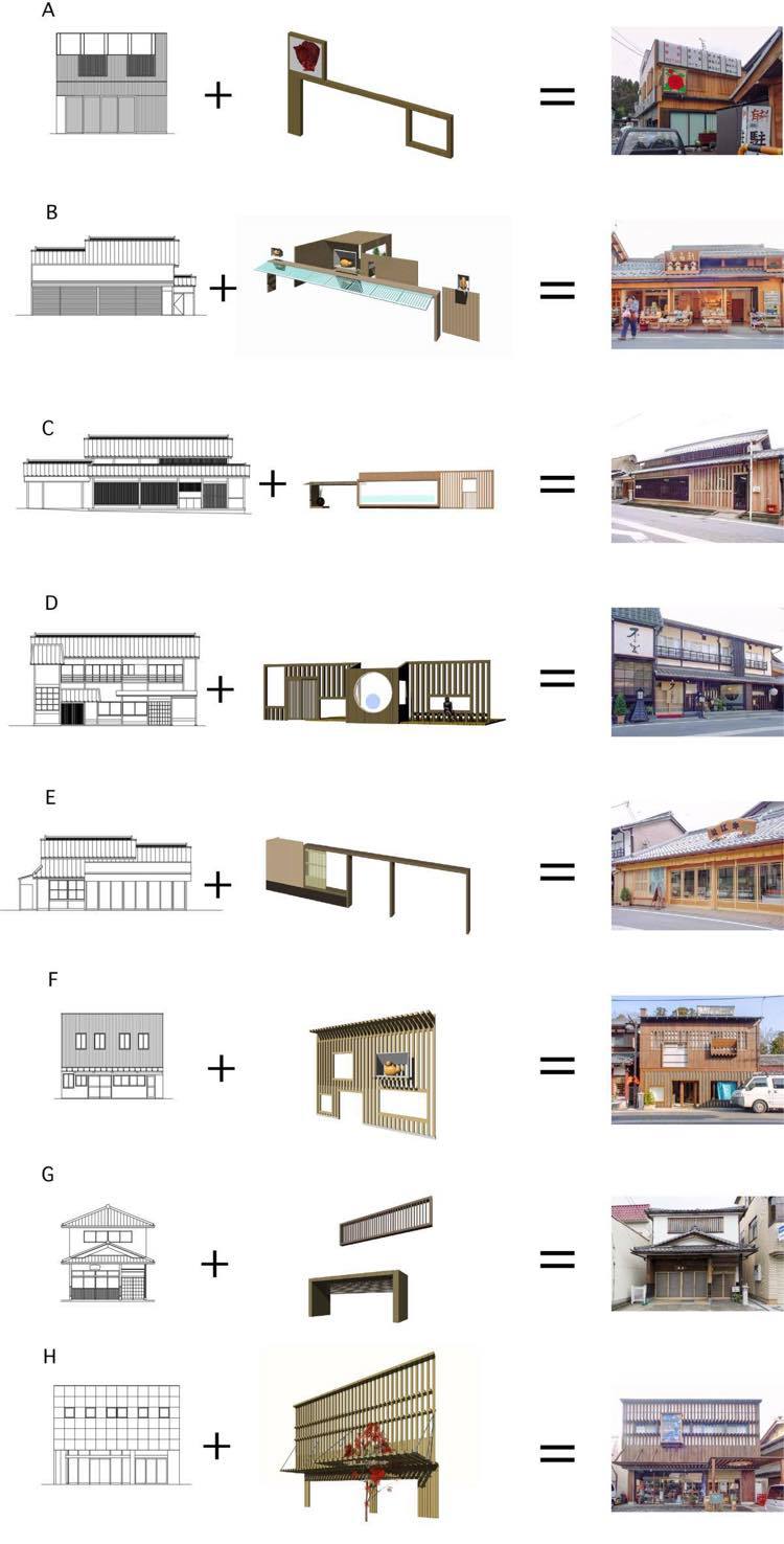 1970年代にシャッターやアルミサッシをつけはじめたことにより、巻き上げBOXの取り付けのために軒先が破壊され、陸屋根の四角い建物のような形態になりした。また、洋風の建材や大きな看板やテントが追加され、和と洋が混成した色とりどりの統一感のない街並みになりました。そこで、失われた軒下を復活し、シャッターを目立たなくし、地元産の4寸角間伐材で門型の木質のファサードをデザインし、木材で作ったオリジナリティー溢れる看板をバランスよく配置していくことにしました。