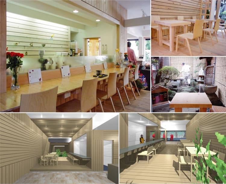ファサードの改修の他に、内装、家具、商品構成を全てデザインしました。4寸のモデュールで統一した木質空間で、道路から中庭まで視線が通るようにし、地獄組の耐力壁で補強されています。