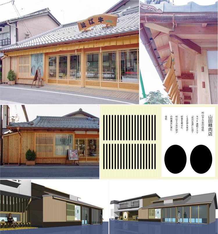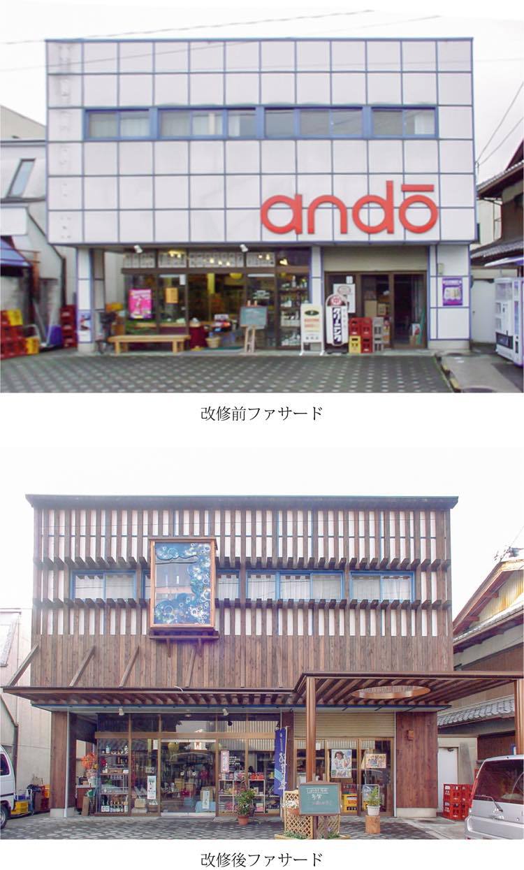 かって町には様々な神様がいました。ファサードを鳥居のような結界発生装置に見立て商空間を神様の宿る空間とし、訪れる人々に 多賀町独自の神聖な空間でお出迎いします。 また、森林の町であり神様の住む町であることから、地元産木材を使った新しい神様の物語を構築し町のイメ ージを外に向かって発信していきます。