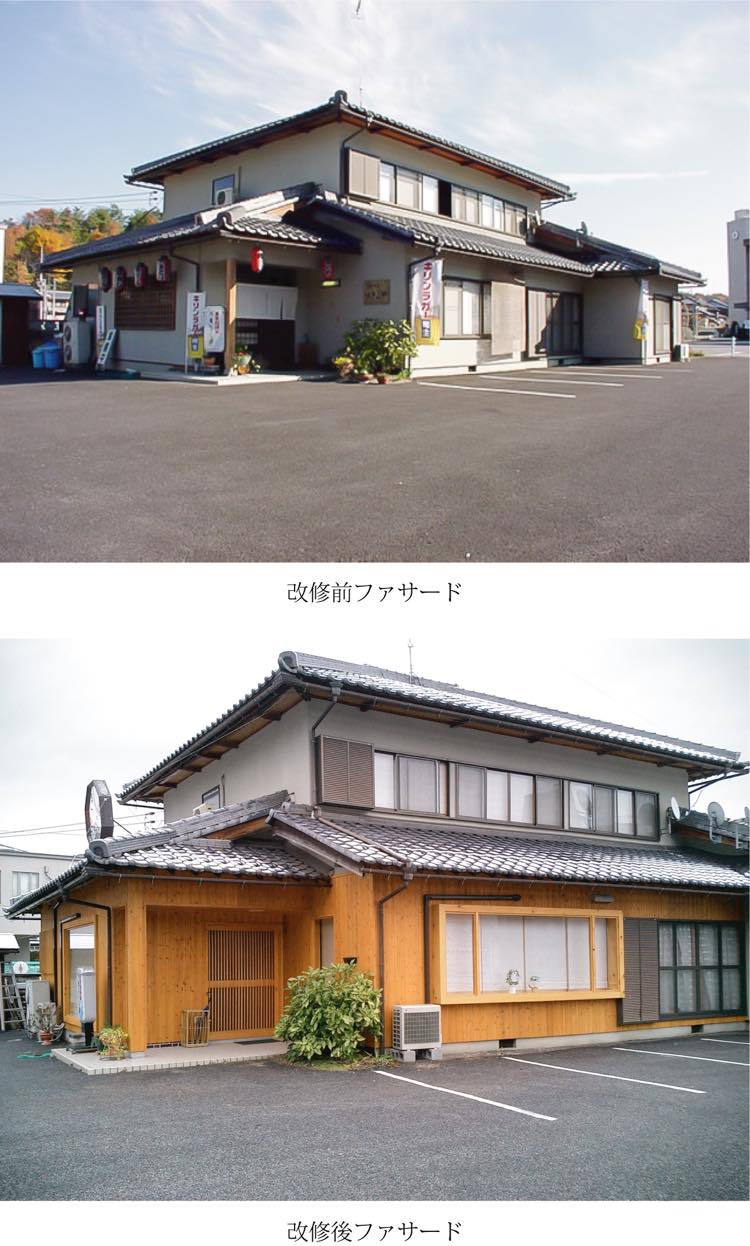 広い敷地にあるため2面を改修しました。4寸角の木材を組み開口部を強調し店舗の存在を高めています。看板を現代アートの画家さんにお願いしました。