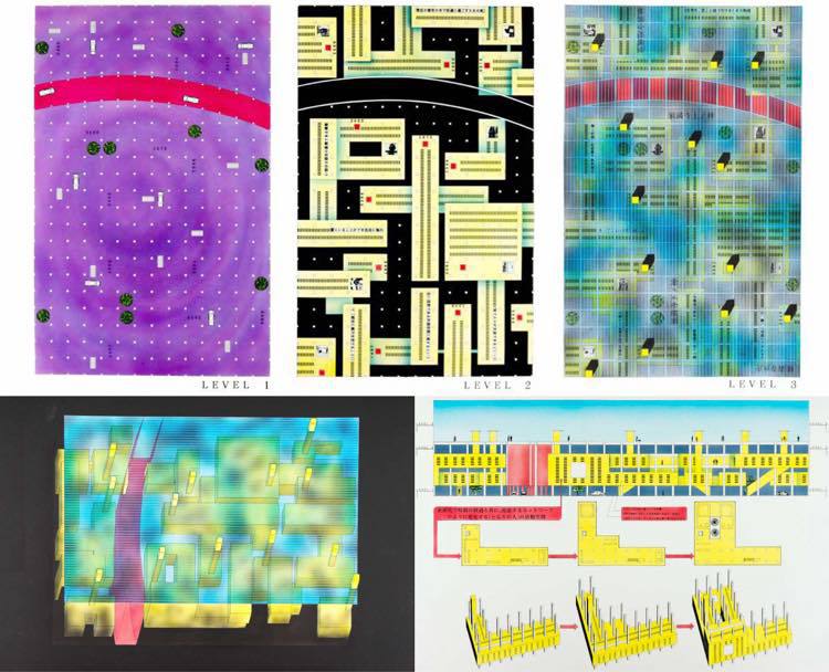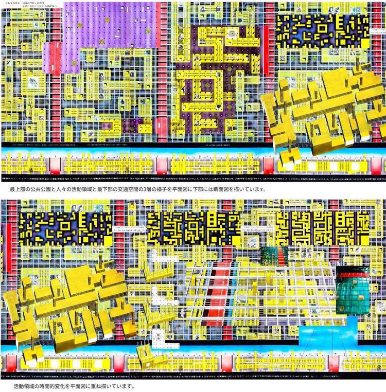となり人プロジェクトの最初のまとめた図面です。空間を三層のレイヤーとして重ねています。
