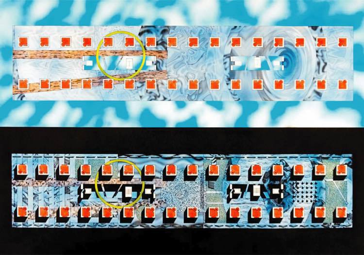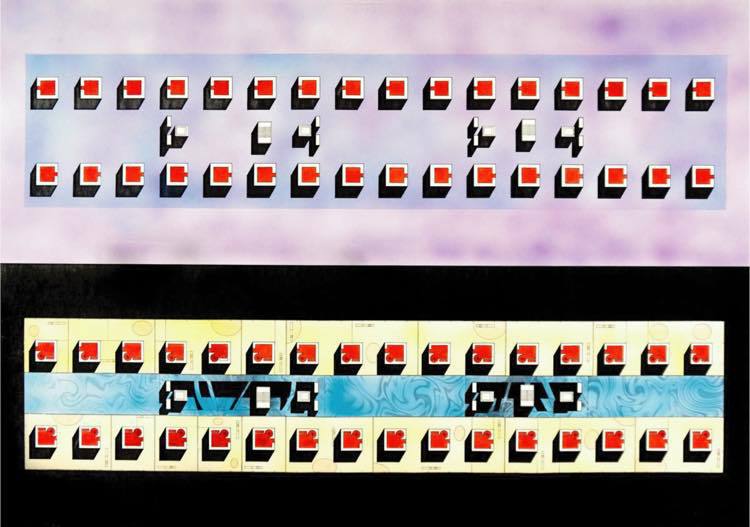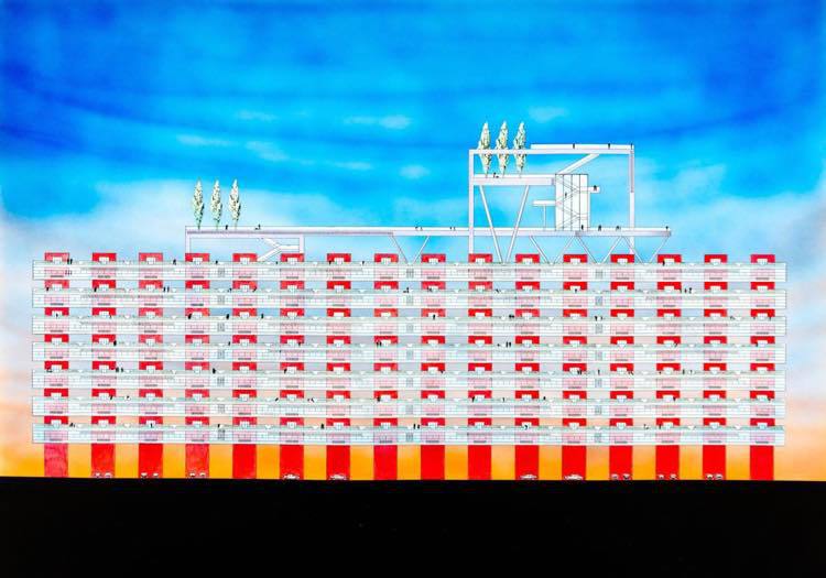 正面から見た図面です。住戸は、ガラス張りの部分で、垂直の移動できる赤い柱で支えられています。屋上には、ステージを組み合わされた立体公園になっています。