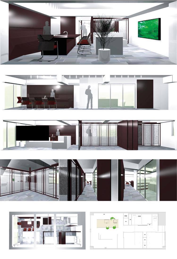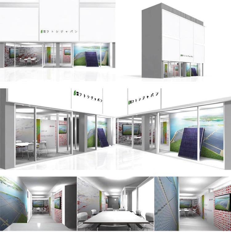 太陽光発電の販売施工の本社社屋の改修案です。外観は、シンブルに社名だけにして1階部分を看板代りのショールームとプレゼンコーナーにし都市空間に発信していきます。