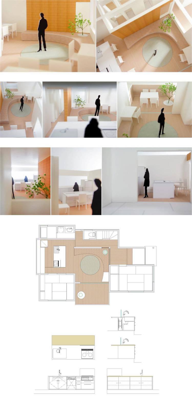 住宅地にある建売住宅の改修案です。玄関、リビング、キッチン、ダイニング、庭をひとつなぎの空間にして家の中心がリビングの円形ソファーになります。