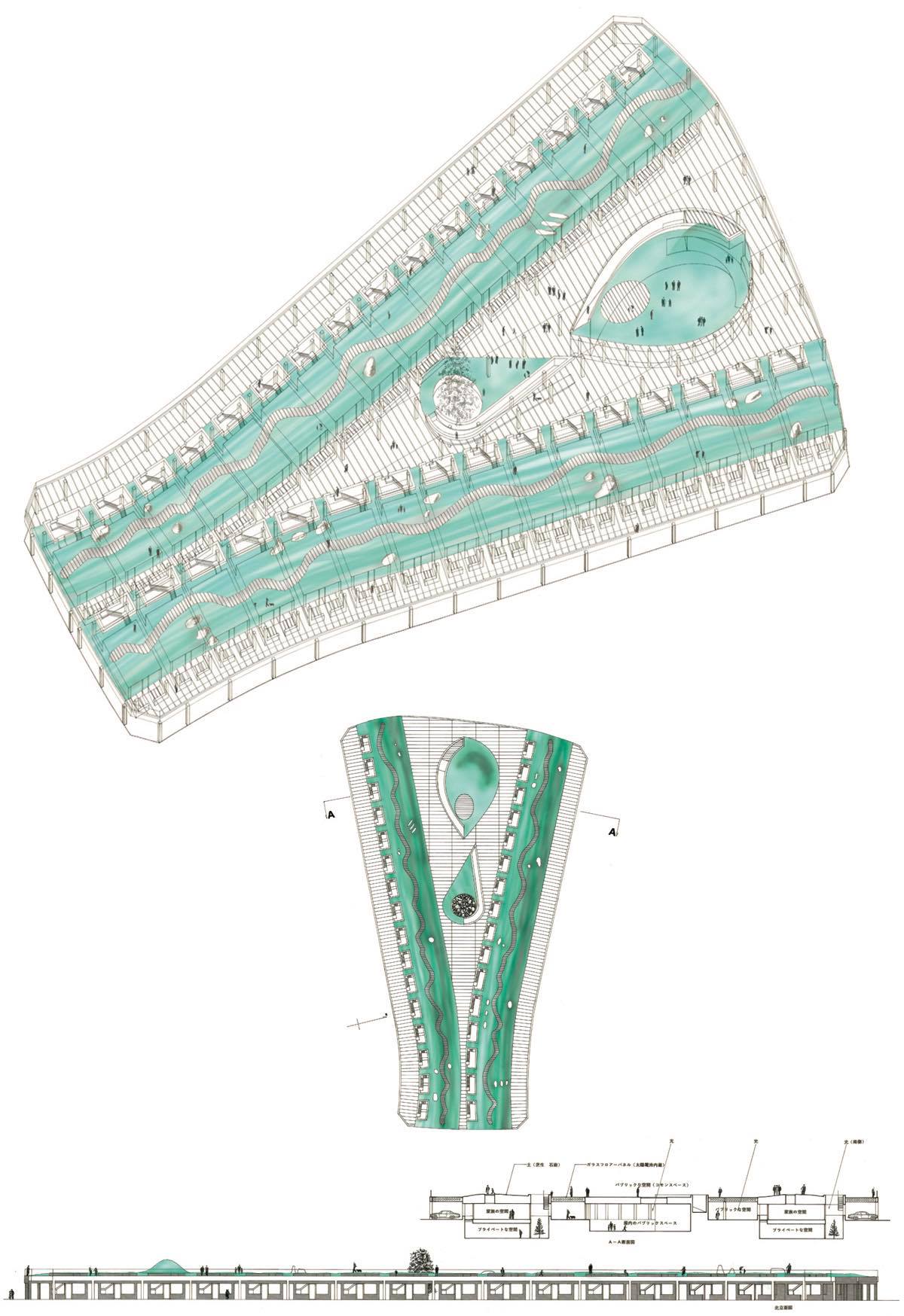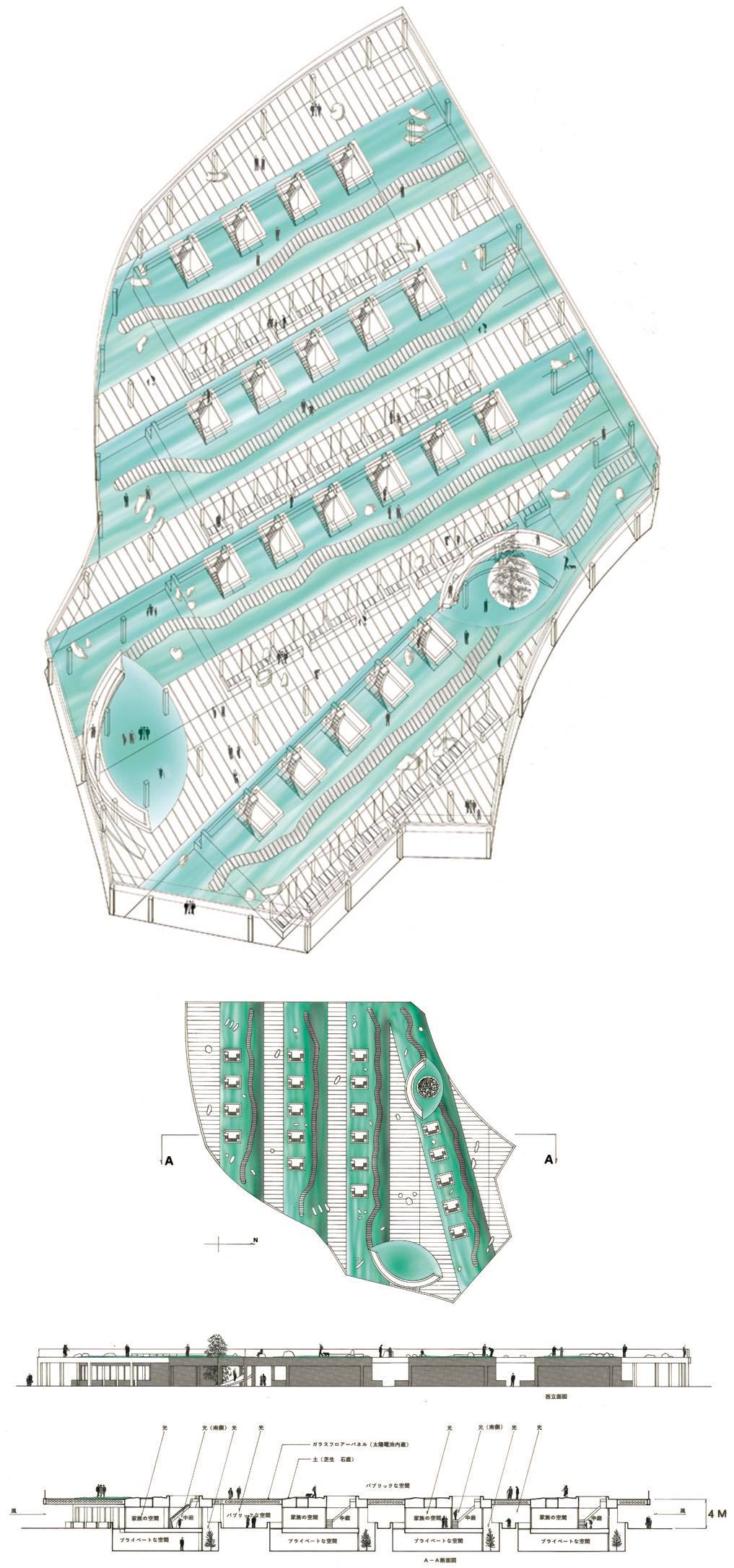 フラットシティーは、現代の都市に対してのアイロニーですが、実際の集合住宅でシュミレーションしてみました。地表面と近づけるためにドライエリヤをもった地下階をを設け歩行用ガラスに庭園があるステージを出現させました。ステージ下は、パブリックな人々の活動領域でその中にプライベートな空間が点在します。